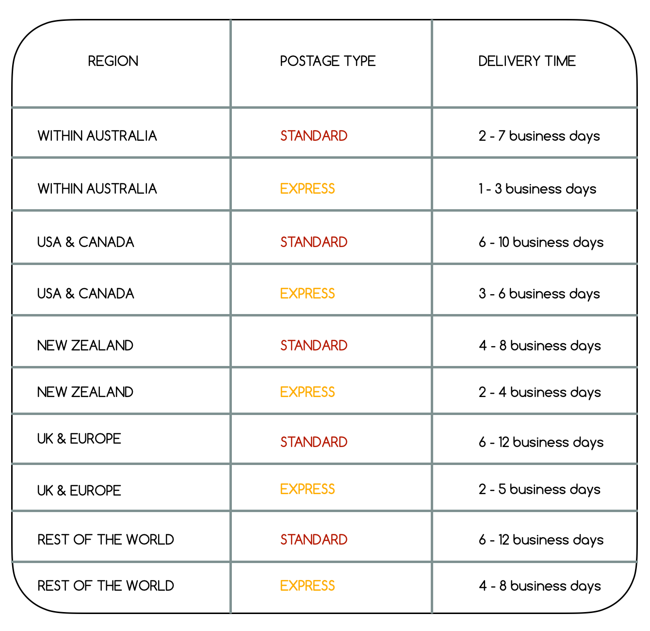 note that shipping times may vary due to public holidays and busy periods.